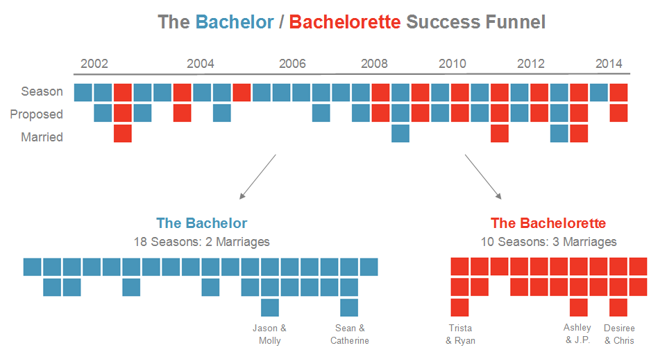 In hindsight it seems pretty obvious that treating candidates poorly, making them jump through hoops, and compete with others are not ideal ways to start a relationship. The above image shows this quite clearly. Whether the Bachelor/ette proposes or not, the chances of a real relationship are quite slim. Plus, who knows how long they last?